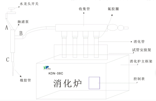 1.首先接抽濾泵的時候保證抽濾泵為三通狀態(tài),及圖上B端內(nèi)孔必須保持與里面的A、C端內(nèi)孔相通,保證消化管內(nèi)的廢氣可以被抽走。如果出現(xiàn)廢氣泄漏比較多,可以檢查此處抽濾泵是否正常,可以旋轉(zhuǎn)B端調(diào)整其位置。
